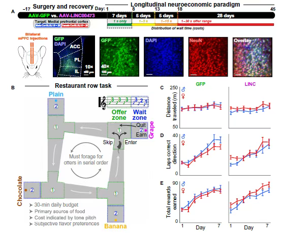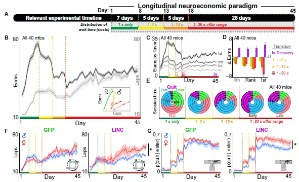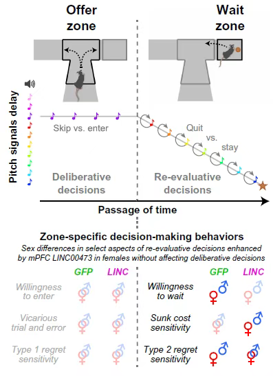 这其实反映了二次评估中“价值函数”的陡峭化,而这种变化正是因为雌性小鼠内侧前额叶皮层(mPFC)中 LINC00473 的表达增强所致。这种“快速退出 + 对时间敏感的重新评估”的双重决策特点,为理解抑郁症的性别差异提供了新角度:比如女性抑郁症患者更易反复权衡沉没成本,可能就与这种机制有关。