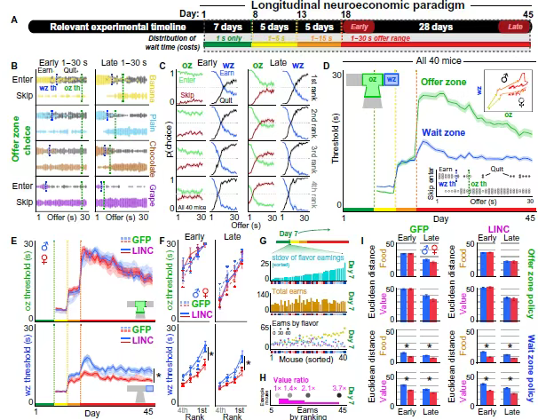 在此基础上,研究人员量化分析了小鼠在经济决策中的具体行为:比如在提供区(OZ)是选择进入还是跳过,在等待区(WZ)是坚持到底还是中途退出,这些选择如何受等待时间和风味偏好的影响。结果发现,雌雄小鼠在等待区的决策策略“最优性”上存在明显差异,但 LINC00473 并没有改变它们的决策阈值—— 也就是“愿意进入”或“愿意等待”的基本倾向没受影响。