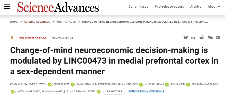 Romain Durand-de Cuttoli et al. ,Change-of-mind neuroeconomic decision-making is modulated by LINC00473 in medial prefrontal cortex in a sex-dependent manner.Sci. Adv.11,eadr3228(2025).DOI:10.1126/sciadv.adr3228