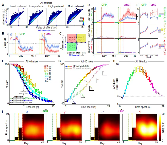 这表明,LINC00473 的表达会选择性调控雌性小鼠基于主观价值(比如对特定风味的偏好)的奖励消费时长(即什么时候离开),却不影响它们趋近奖励的动机(即是否愿意进入)。这种“只影响退出、不影响趋近”的价值依赖行为差异,也为后续实验中观察到的雌性小鼠“及时止损”策略埋下了伏笔。