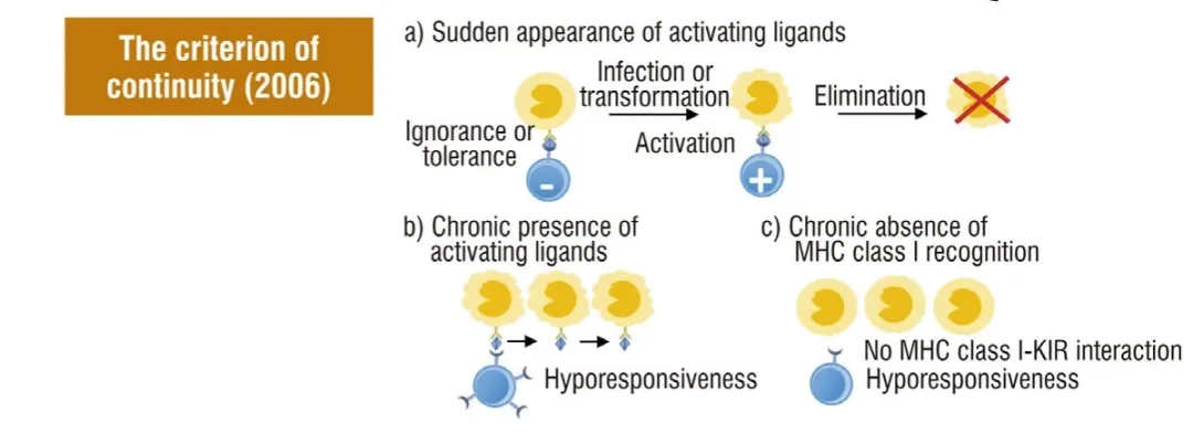 Pradeu和Carosella设计了“连续性准则”,试图更好地解释有悖于“自我-非自我”辨别的免疫原性概念。CST根据对外来物的识别解释了为什么以及何时发生免疫反应,然而,CST的自我概念并不能解释为什么自我成分经常引发免疫反应,而许多外来成分被生物体耐受。为了解决这个问题,他们提出免疫系统耐受一组内源性和外源性抗原,每天以一定的频率与这些抗原接触,免疫反应是由这些抗原模式的不连续性引发的。不连续性被定义为:[1]某种抗原数量的变化;[2] 新抗原和系统已经适应的抗原之间的分子差异程度;以及[3]新抗原模式的出现速度(接触频率的变化)。因此,连续性标准与自我-非自我理论的区别在于,免疫原性标准不是抗原的来源,而是相关组织的变化速度。