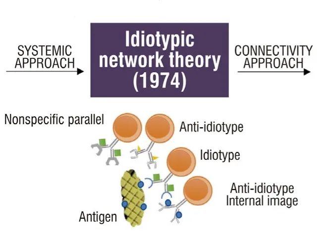 十年后,Jerne提出了“免疫网络假说”,该假说认为,识别其他免疫球蛋白不同部分的抗免疫球蛋白的存在将使网络中生物体的所有淋巴细胞相互连接。当时,Jerne根据每个人能识别的Ig可变区部分预测了两种抗独特型抗体子集。一个子集将针对不负责抗原结合的独特位,称为抗独特型集。另一个子集将针对与抗原结合位点重叠的独特位,因此,其独特位类似于抗原的构象结构。Jerne将第二个子集称为抗原的“内部图像”。已经表明,内部图像不仅在形状上而且在功能上都与抗原相似,在某些实验条件下,它们可以刺激针对抗原的特异性抗体的产生。此外,Jerne提出,独特型网络理论(INT)将是解释免疫前库选择、自然自身免疫、记忆和外周耐受的关键,因为抗抗体的反馈控制足以在不与抗原接触的情况下确定和维持免疫库,并抑制自身免疫性疾病的发展。因此,对于INT,耐受性和免疫反应是网络的特性,当与抗原接触时,它能够控制具有自身独特型的克隆,并激活其他抗原特异性的克隆。