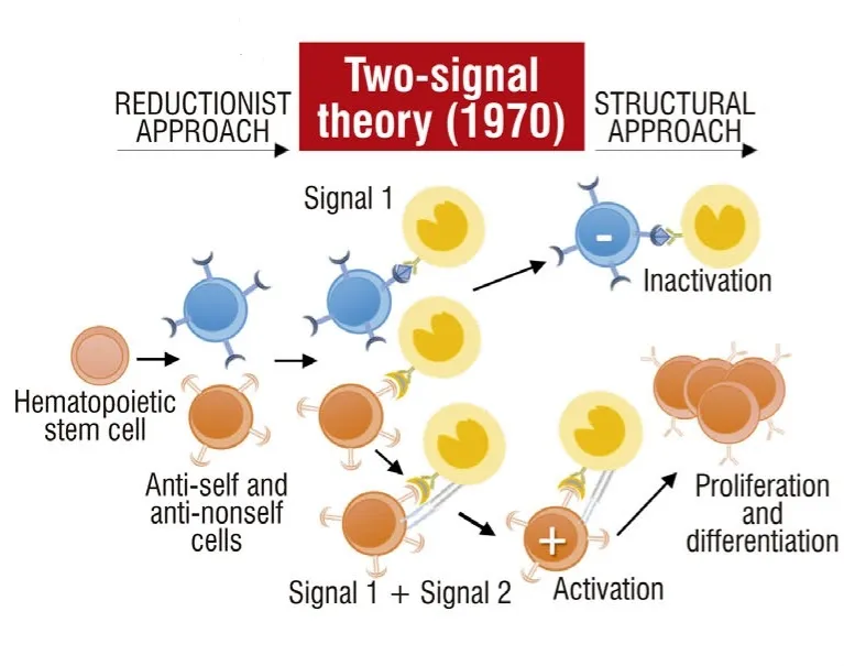 Bretscher和Cohn的“两个信号”/“抗原的关联识别”理论接受了大多数CST框架,包括自我-非自我辨别的需要,但认为淋巴细胞激活有以下限制:(i)为了被激活,淋巴细胞必须接收两个信号:来自其抗原结合受体的信号1和来自效应调节细胞(T辅助细胞)的信号2,效应调节细胞“告诉”第一个细胞其行为应该是什么;(ii)如果淋巴细胞仅接收信号1,则其无法激活。因此,对自身抗原具有特异性的新出现的克隆将通过接收信号1立即失活,这解释了无能的机制和必要性,这一理论主要基于实验证据。