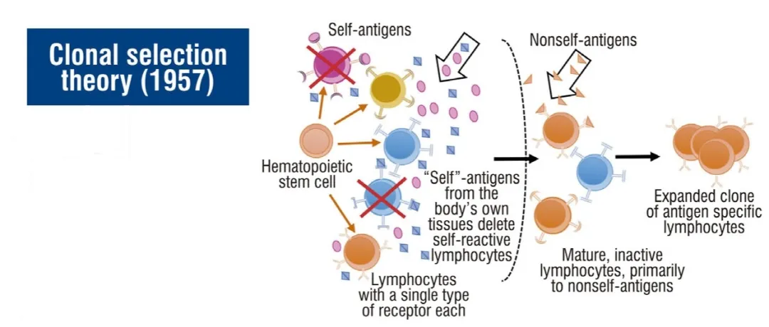 CST最早由Burnet于1957年提出,它基于Jerne的自然选择理论和类似于Talmage提出的概念。CST解释了免疫系统如何对抗原作出反应并形成记忆:(A)每个淋巴细胞及其克隆后代都携带一个抗原结合受体的单一克隆,该克隆具有独特的特异性,是由基因片段的重组和抗原结合受体可变区的突变随机产生的;(b) 抗原结合受体诱导细胞活化、增殖和分化,否则不会活化;(c) 被招募的细胞负责对抗感染或癌细胞,并产生处于休眠状态的记忆细胞,该记忆细胞准备在与抗原进一步接触时被再活化;(d)在初级淋巴器官的个体发育过程中,携带自身分子受体的淋巴细胞都会被清除,或者在外周受到其他机制的抑制。根据最后一个假设,可以得出结论,根据CST,免疫系统通过不检测或在意外检测时忽略自身分子来区分自我和非自我。