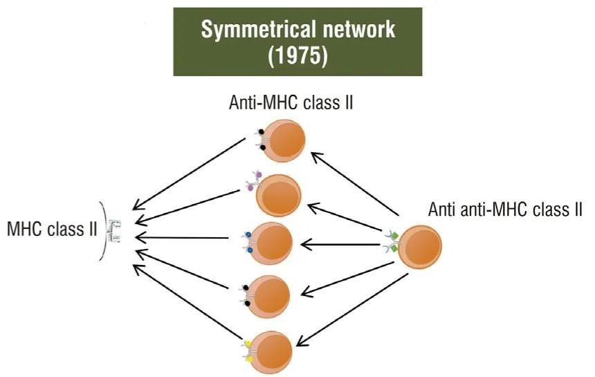 “对称网络理论”最早由霍夫曼于1975年提出,并在接下来的几年里进行了修改,以适应新的实验证据。对称网络理论修改了Jerne的各种抗独特型抗体,认为对于可以形成免疫反应或耐受的每种抗原,免疫系统中都存在两组相应的独特型:(a)通过互补相互作用(互补图像)识别抗原的独特型;(b) 识别抗原抗体可变区的独特型,因此在功能上与抗原相似(内部图像)。换句话说,只有当抗原与至少一个独特位基因相似时,它才是抗原。从这一假设中可以得出,免疫系统只会识别、处理和响应系统中编码为内部/互补图像集的抗原,独特型网络是决定免疫库大小和多样性的一个因素。