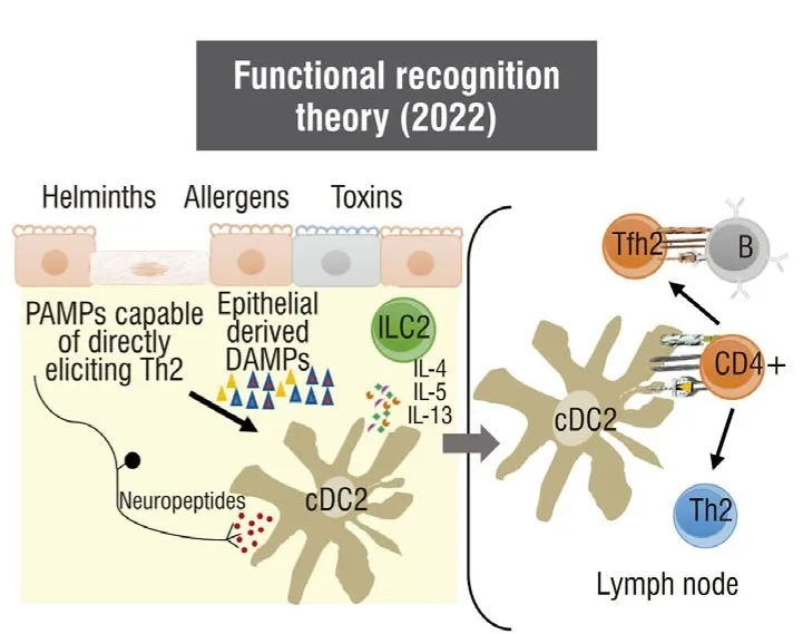 功能识别理论是危险信号理论的延伸,该理论提出免疫识别可以在没有抗原特异性结构识别的情况下发生。在识别出攻击行为后,免疫系统会触发效应机制来维持体内平衡。根据免疫细胞活化和细胞因子释放的特征,将反应分为Th1、Th17或Th2型。Th2反应由蠕虫、毒素和过敏原诱导,由先天2型淋巴细胞和CD41 Th2细胞协调,产生细胞因子IL-4、IL-5、IL-9和IL-13。Th2免疫原不具有共同的结构特征,似乎不能被PRRs直接识别。功能识别理论提出,Th2免疫原通过其功能特性被识别,例如促进损伤相关分子模式的释放和激活感觉神经元的能力。因此,具有相同性质(蛋白酶、碳水化合物活性酶、配体结合蛋白等