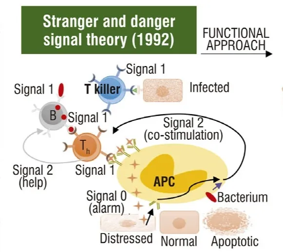 Janeway关键性地假设PAMP在本质上是非自我的。然而,后来的研究表明,自身分子也可以激活PRRs,PAMPs也存在于非感染性生物体中,如正常的肠道菌群。因此,Janeway关于“陌生人”只存在于传染性非自我中的假设并不成立。为了解决这个问题,Matzinger声称,免疫反应不仅是由外来分子触发的,而且是由“来自受损细胞的内源性细胞警报信号”触发的。因此,如果自身成分发出危险信号(如细胞压力或破坏),它们可能会引发免疫反应;如果非自身成分不危险(例如胎儿或共生细菌),则可以耐受。此外,危险信号理论还声称,在存在危险的情况下发生的自身免疫不会持续,因为在危险信号消除后,外周耐受机制将迅速启动以控制免疫系统。