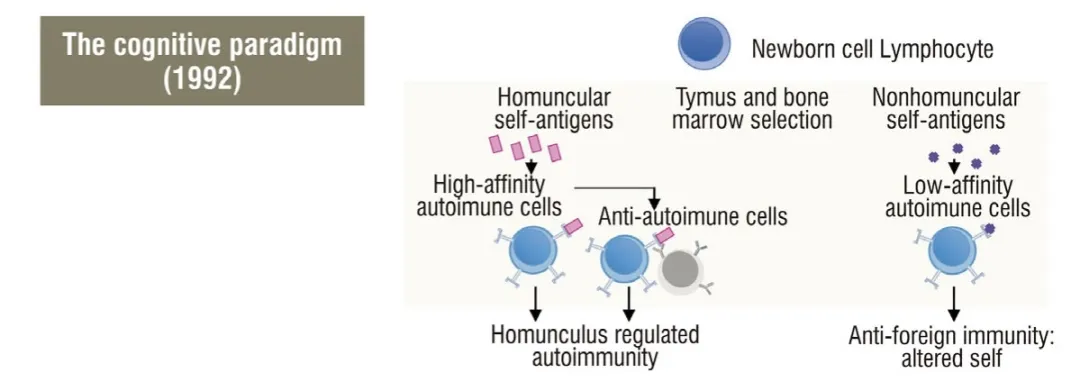 Cohen提供了一种处理自身免疫的替代范式。他的“认知范式”基于INT和二阶控制论原理,即任何收集和处理信息的系统都会通过对其主体的内部表示来最有效地完成工作。他还认识到克隆选择的发生,以及在锻造免疫系统中最重要的力量是由传染性病原体施加的力量,但他认为免疫系统的目的是提高生物体对环境的适应性,而不是区分自我和非自我或对抗危险。