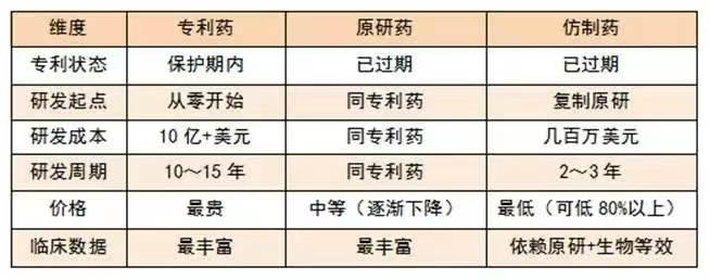 当专利药过了专利保护期后,由原生产商生产的药品称为原研药。原研药是指临床上已经投入使用的新药,它是在经过对成千上万种化合物做层层筛选和严格的临床实验后,得以获准上市的药物。原研药具有完整和充分的安全性、有效性数据作为上市依据,其研发过程严格遵循相关法规和标准,质量和疗效有较高的保障。