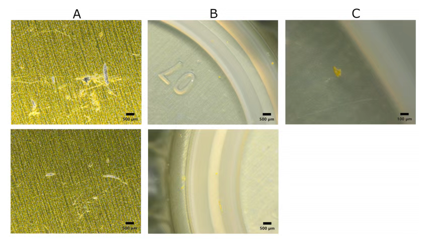 为进一步验证,研究人员对玻璃瓶的瓶盖展开了详细观察。他们发现,即便全新的瓶盖,其外表面仍存在划痕,内表面则吸附着与瓶盖漆同色的碎片(如下图所示)。随后的模拟封装实验结果进一步证实:瓶盖外层的聚酯类油漆涂层在生产、运输、储存过程中发生的磨损和剥落,正是玻璃瓶装饮料微塑料污染的主要来源!
