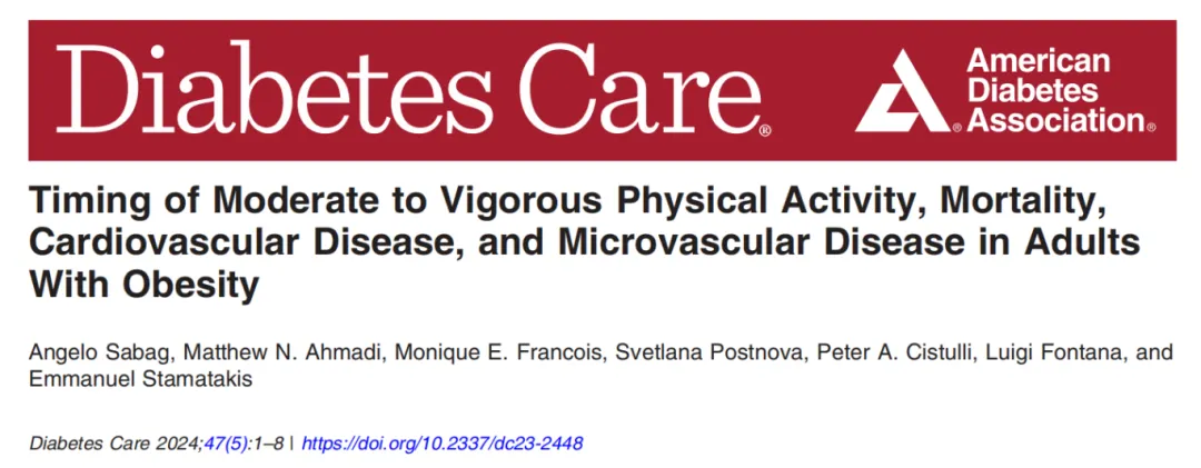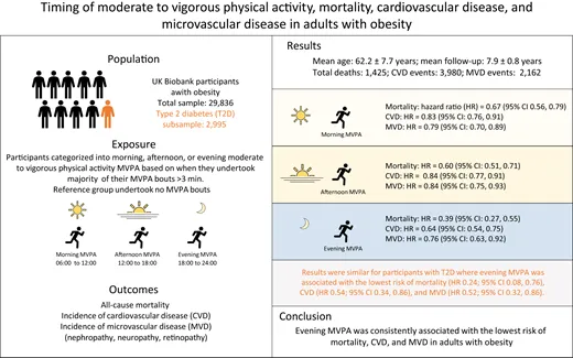 众所周知,肥胖可能引起2型糖尿病(T2D)、心血管疾病(CVD)、微血管疾病(MVD)等代谢性慢性疾病,同时还严重影响身体健康。有报告指出,进行中等至剧烈体育活动(MVPA),尤其是有氧运动,不仅可以改善心血管相关疾病的风险,晚间MVPA还可以改善昼夜节律变化引起的葡萄糖耐量和胰岛素抵抗。因此,本研究对肥胖及患有T2D成年人MVPA的时间与CVD、MVD的发生率和死亡率之间的关系进行了进一步的探究。