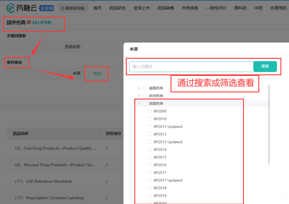 ③如果是通过企业版查询可通过高级搜索查询-->添加来源-->英国药典(多个版本)