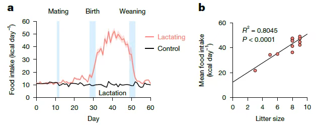 图1. 哺乳期母鼠表现出显著的进食量上升,提示其具有更强的食欲驱动。母鼠的进食动机与能量需求(由幼崽数量决定)密切相关,反映出一种“按需摄食”的生理调控机制。