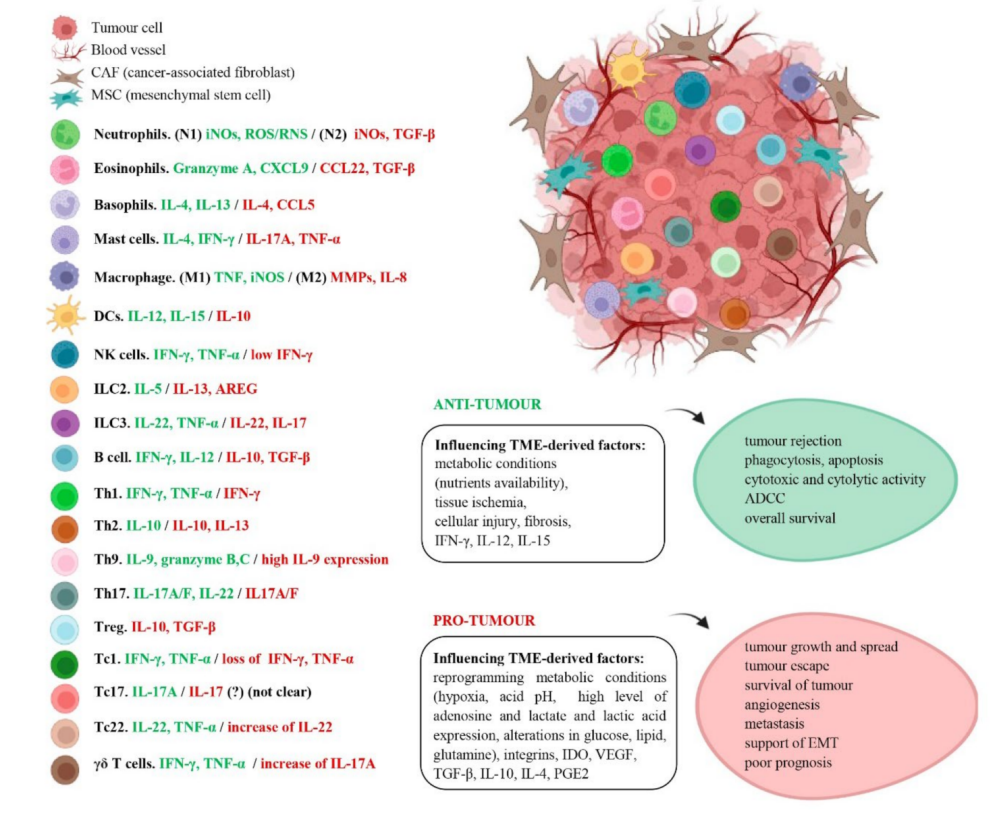 2. Dual Effect of Immune Cells within TumourMicroenvironment: Pro- and Anti-Tumour Effects and Their Triggers. Cancers(Basel). 2022 Apr; 14(7): 1681.