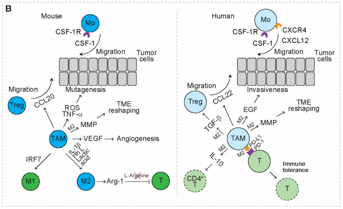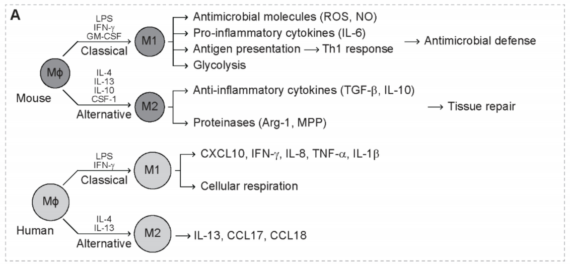 肿瘤相关巨噬细胞(TAM)在功能上是异质性的,分为两个主要亚群,M1和M2巨噬细胞。在对脂多糖(LPS)、IFN-γ和GM-CSF的反应中,M1巨噬细胞经历经典激活并优先分泌抗菌分子和促炎细胞因子,包括活性氧(ROS)、一氧化氮(NO)和IL-6。M1巨噬细胞是抵抗微生物感染的第一道防线。M1巨噬细胞还保持强大的抗原呈递能力,诱导强烈的Th1反应。