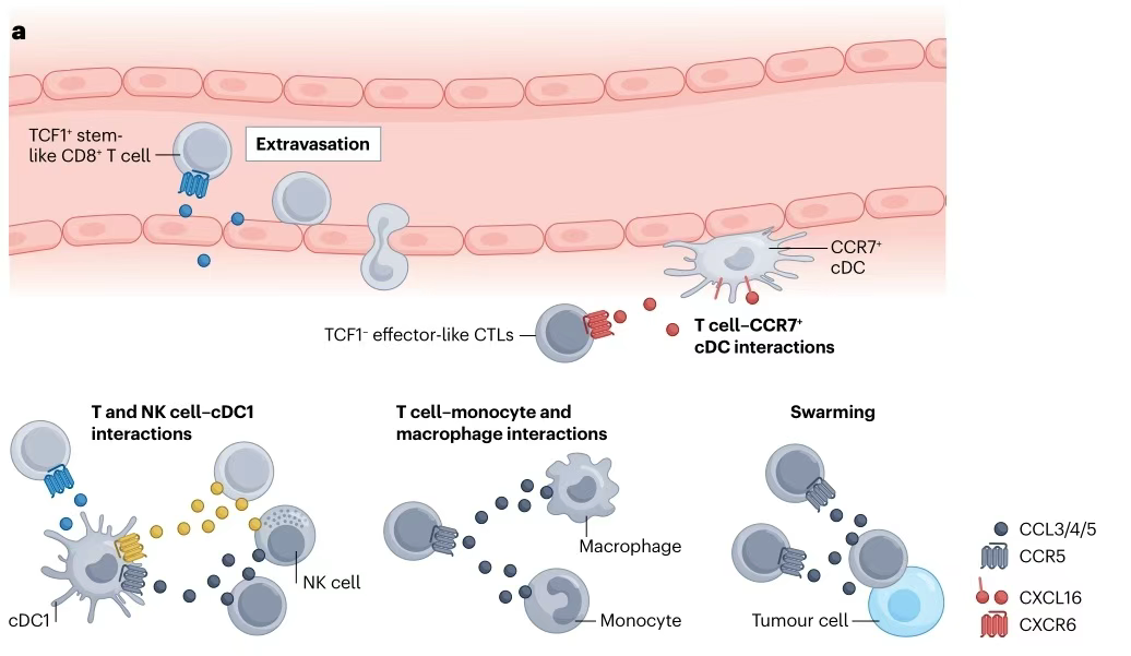 在强抗肿瘤免疫的条件下,表达CXCL16的CCR7+cDC亚群聚集在基质小静脉周围,在那里它们与表达CXCR6的外渗效应CTL相互作用,并提供生存和共刺激信号,以维持它们在肿瘤微环境TME中的增殖扩张。