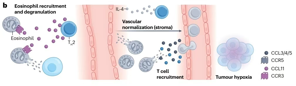 参与2型免疫反应的免疫效应细胞上表达的主要趋化因子受体是CCR3、CCR4和CCR8。有趣的是,CCR4和CCR8的表达与Treg细胞共享,这可能反映了2型免疫和免疫耐受之间的密切关系,以及炎症消退以实现有效组织修复的要求。TH2细胞分泌的CCL11可引起TME中嗜酸性粒细胞的积累和脱颗粒,使毒性颗粒蛋白损伤癌细胞。嗜酸性粒细胞的颗粒含量以及TH2细胞产生的IL-4也可以促进基质微血管的正常化,支持T细胞的积聚,并通过将血流转移到外周肿瘤间质来引起肿瘤核心的缺氧。