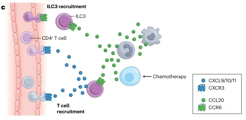 某些化疗药物,如顺铂,可以诱导其配体CCL20在小鼠上皮肿瘤中的表达。这是表达CCR6的ILC3积累所需的,其反过来产生CXCL10以募集CD4+和CD8+效应T细胞。癌细胞来源的CCL20和ILC3对于化疗的治疗效果及其与PD-1靶向或CTLA-4- ICTs的协同作用至关重要。