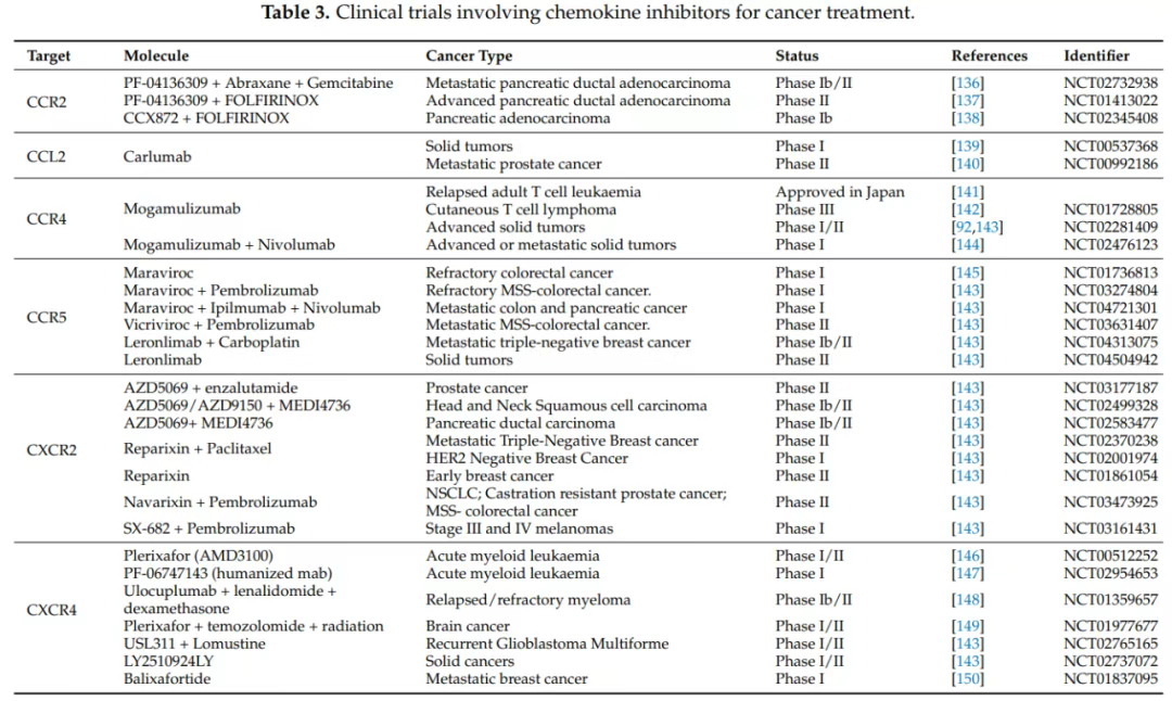 目前,临床已批准的靶向趋化因子的药物包括:抗CCR4抗体(Mogamulizumab)和CXCR4拮抗剂(Plerixafor,AMD3100),用于血液恶性肿瘤。此外,还有更多的针对不同趋化因子受体-配体轴作为癌症治疗策略的多种努力,这些治疗策略目前已表现出巨大的潜力,正处于临床开发中。