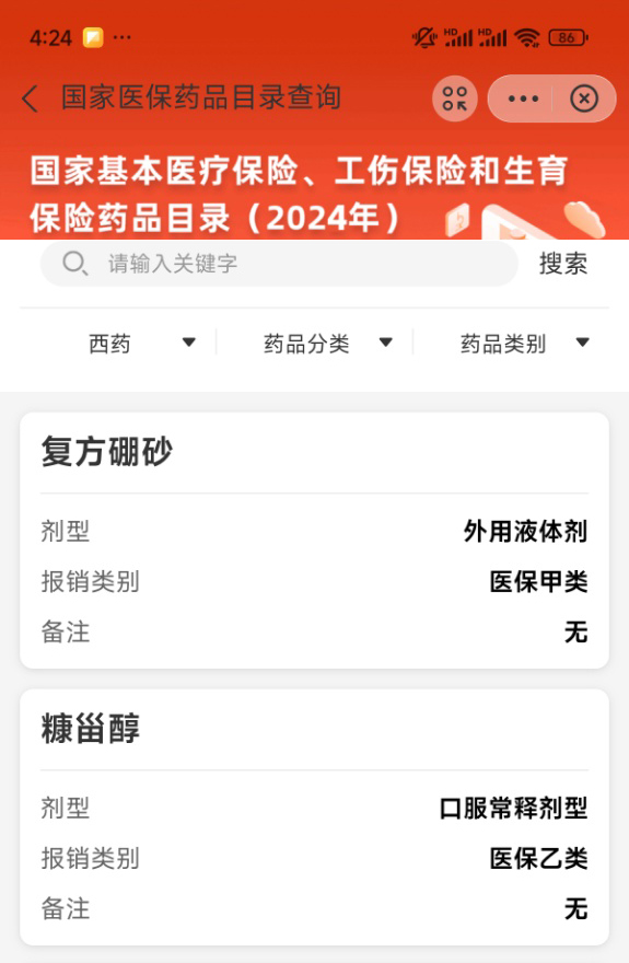 3. 点击首页“医保药品目录查询”(或搜索框直接搜药名);