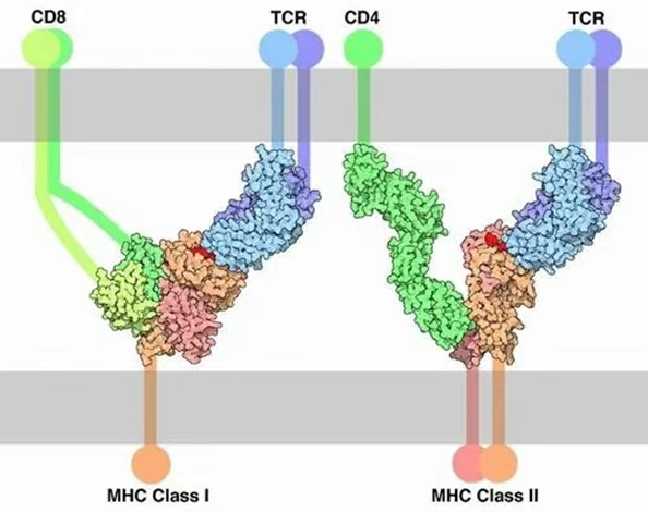 杀伤性T细胞主要识别MHC I类分子提呈的抗原,而辅助性T细胞则主要识别MHC II类分子提呈的抗原。这就引出了一个问题,怎么保证杀伤性T细胞只识别MHC I类分子,而辅助性T细胞只识别MHC II类分子呢?答案就是我们之前提到的CD4和CD8这两个助手。它们就像两把精准的钳子,CD8专门钳住MHC I类分子,CD4则钳住MHC II类分子。这样,T细胞就能准确地找到并结合对应类型的MHC分子。