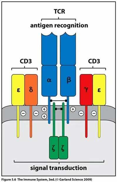 一旦TCR识别了由MHC分子所提呈的同源抗原,接下来T细胞表面发生识别的信号将传递至T细胞核内。就像BCR一样,αβ TCR有一个非常完美的胞外区可以结合它的配体,但是α和β蛋白的胞质尾部只有大约3个氨基酸的长度,太短了以至于无法传递信号。这时候大自然给我们配置了铃铛和口哨,也就是CD3蛋白复合体。这个复合体由四个不同的蛋白质组成,分别是γ、δ、ε和ζ。CD3复合体就像一个信号放大器,它跟TCR α和β链一起打包运输到细胞表面。TCR负责识别,CD3负责把信号传回细胞内部。所以,一个真正能干活的、成熟的TCR,其实是整个TCR加CD3复合体这个团队在工作。缺了任何一个成员,这个T细胞就没法正常工作了。