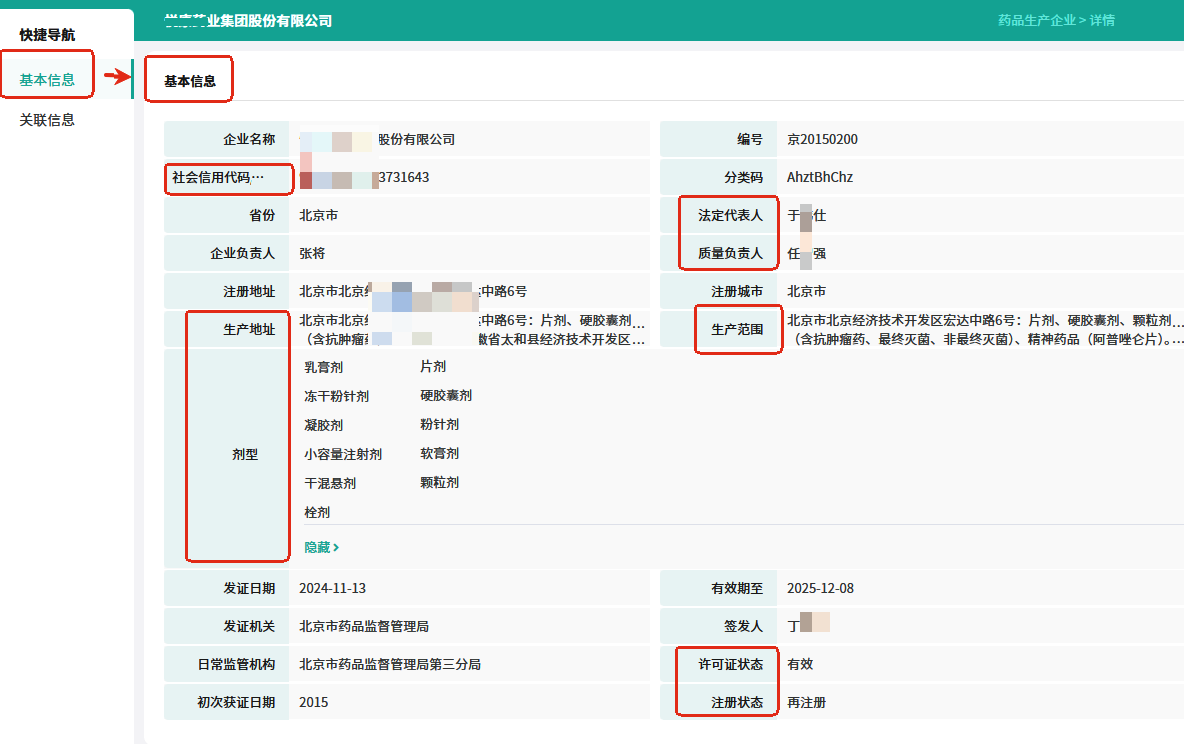 可以看到,显示的搜索结果中有部分基础信息,若要查询更多的药品企业生产信息,则需点击绿色企业名称进一步查看。详细信息中包含了基本信息和关联信息两大类别。