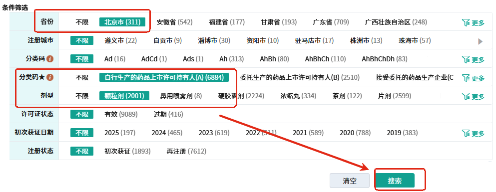 操作路径:条件筛选板块中,在【省份】中选择【北京市】、于【分类码★】中选择【自行生产的药品上市许可持有人(A)】、【剂型】中选择【颗粒剂】,点击【确定】后即可查询于北京市所有能自行生产“颗粒剂”的药品生产企业。在搜索结果中点击绿色的企业名称即可查看药品生产企业的具体信息,点击右上角的下载与导出能自定义内容下载全部的药品生产企业。