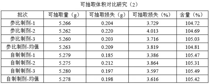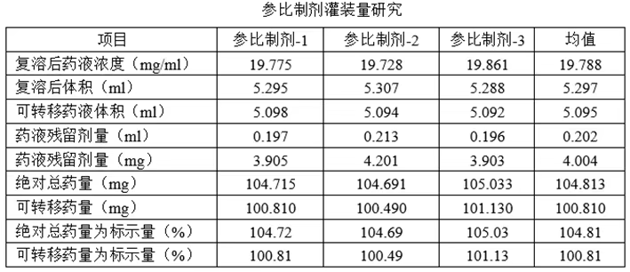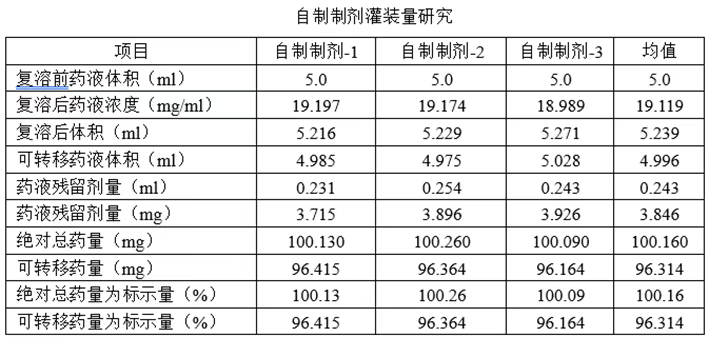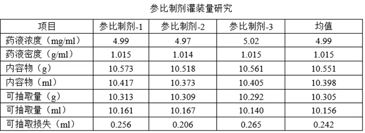 根据参比制剂说明书中的用法用量,采用参比制剂说明书上的溶剂对多批次自制制剂和参比制剂进行复溶,并对自制制剂和参比制剂的可抽取体积进行对比,以证明灌装量的合理性。