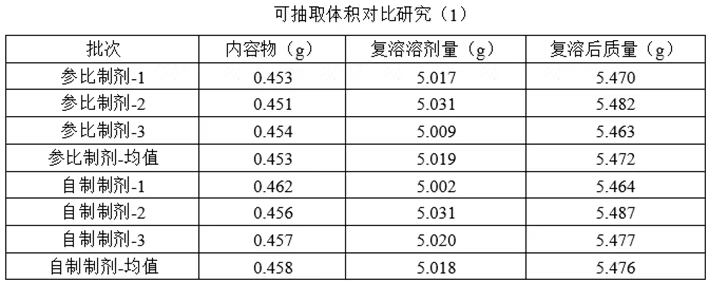 PS:如果没有微量密度检测仪,可不检测药液密度,仅通过内容物(g)、可抽取量(g、ml)、可抽取损失(g)进行自制制剂和参比制剂的可抽取体积对比。