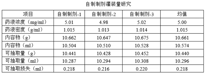 参比制剂灌装量为10.398ml,可转移药量为10.156ml,药液残留剂量为0.242ml,自制制剂灌装量为10.574ml,可转移药量为10.296ml,可抽取损失为0.218ml,自制制剂与参比制剂的可抽提损失无明显差异,自制制剂与参比制剂的含量均符合质量标准,由此可知,自制制剂灌装量范围:10.50ml~10.70ml,目标灌装量:10.60ml,自制制剂的可抽取损失和含量与参比制剂保持一致,自制制剂的灌装量合理,并确保了每支(瓶)产品的给药剂量均不低于说明书标示的给药剂量。