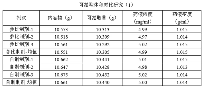 根据参比制剂说明书中的用法用量,对多批次自制制剂和参比制剂的可抽取体积进行对比,以证明灌装量的合理性。