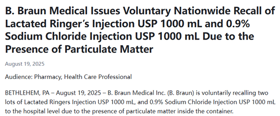 2025年8月19日,B. Braun Medical Inc.因两款无菌注射液(乳酸林格氏注射液USP 1000mL、0.9%氯化钠注射液USP 1000mL)容器内存在颗粒物启动全美召回,尽管暂未报告不良事件,但该事件再次印证:静脉用无菌注射液的颗粒物污染可能引发肺栓塞、器官损伤甚至死亡。