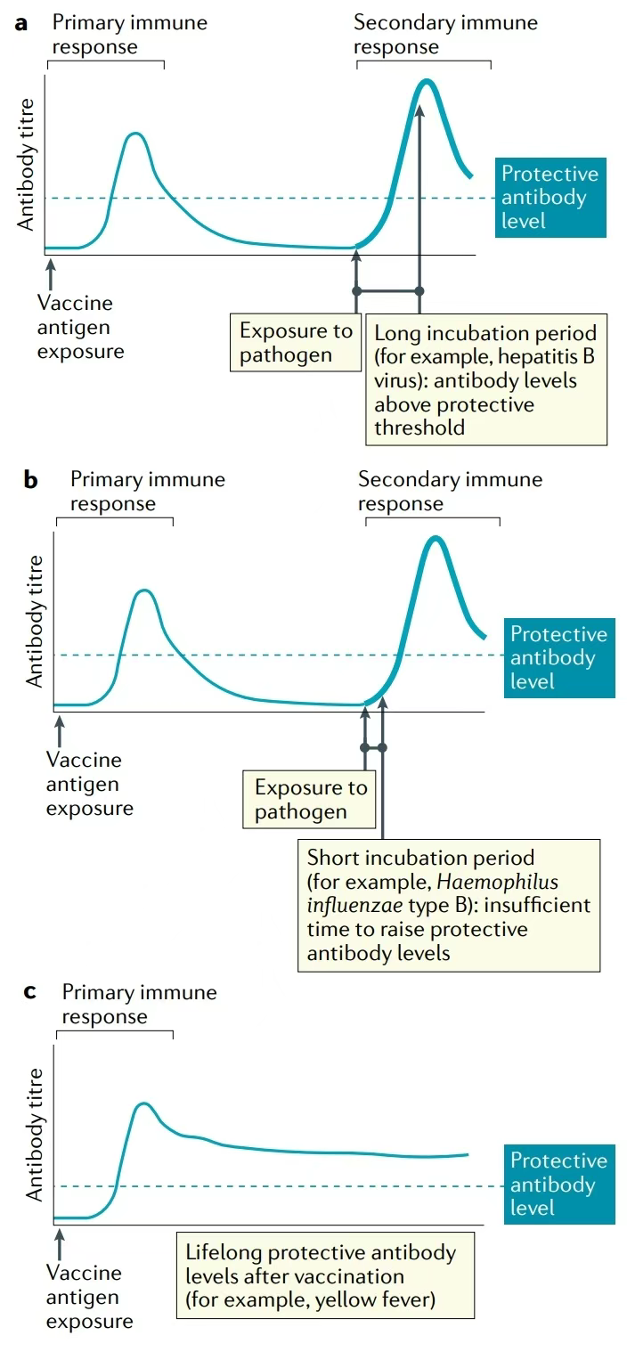 初次接种疫苗后,循环中的抗体水平会下降,通常低于保护所需的水平。免疫记忆是否能防止未来遇到病原体而患病,取决于感染的潜伏期、记忆反应的质量以及记忆B细胞诱导的抗体水平。如果病原体暴露和症状出现之间有很长的潜伏期,高于记忆B细胞产生大于保护阈值的抗体滴度所需的天数,记忆反应可能足以抵御疾病发生。如果病原体潜伏期短,并且在抗体水平达到保护阈值之前迅速发作,那么记忆反应可能不足以预防疾病。而在某些情况下,初次接种疫苗后的抗体水平是始终保持在保护阈值以上,可以提供终身免疫力。