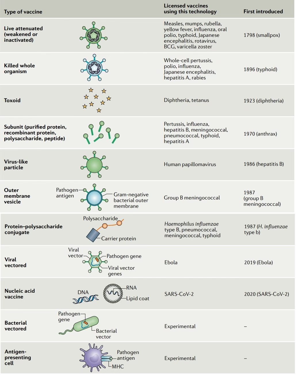 疫苗通常分为活疫苗或非活疫苗,以区分那些含有相关病原生物的减毒复制株的疫苗与那些只含有病原体成分或灭活的疫苗。除了“传统”的活疫苗和非活疫苗,在过去几十年中还开发了多种平台,包括病毒载体、基于核酸的RNA和DNA疫苗以及病毒样颗粒。