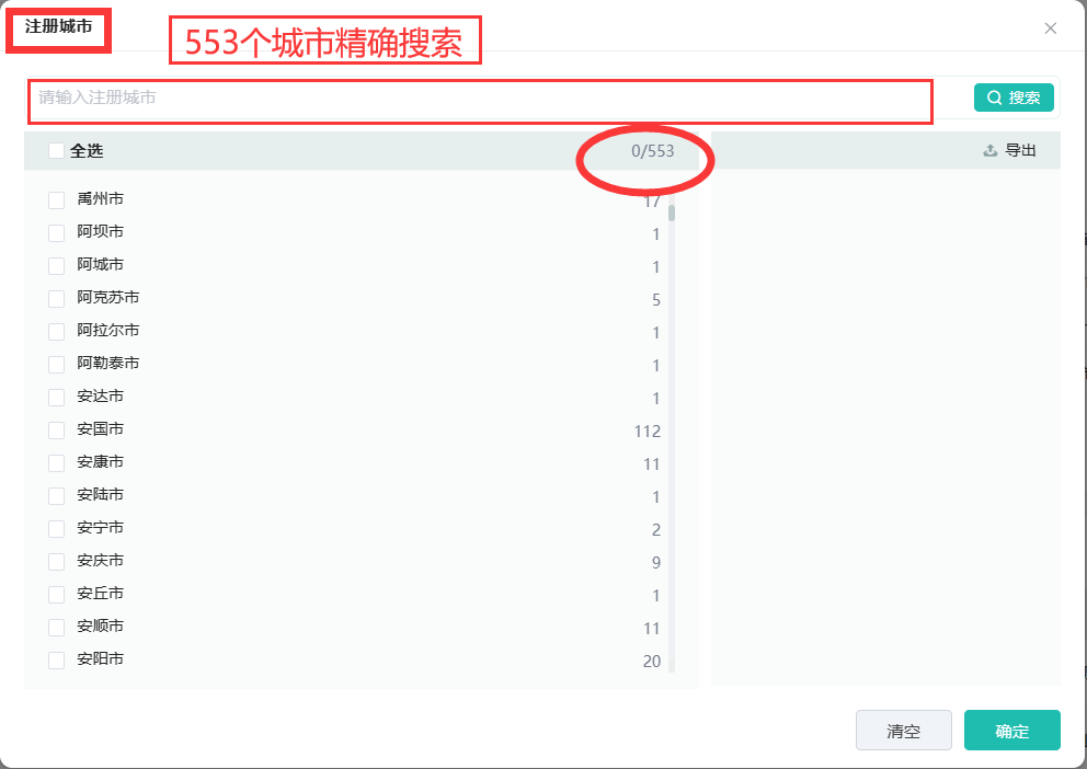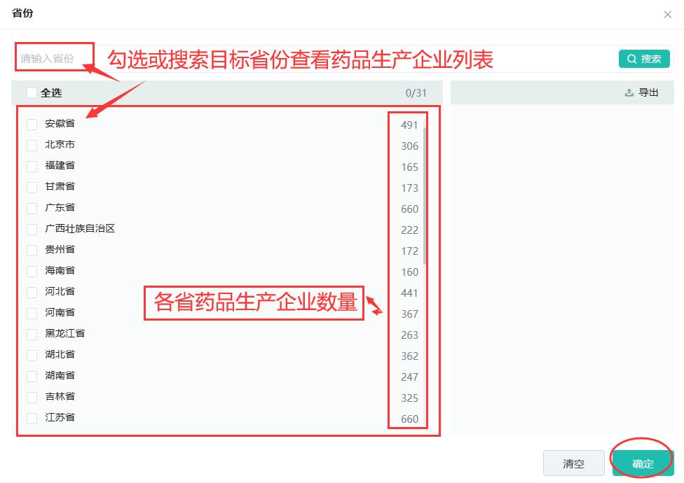 如(图1)通过条件筛选’省份’点击’更多’可以看到如下页面,可以在搜索框内精准输入目标省份查看药品生产企业列表名单,也可以通过勾选各省份点击’确定’进行查看,在勾选框中能清楚看到各省份的药品生产企业数量;同理,不同城市的药品生产企业信息查看方法也是一样的。