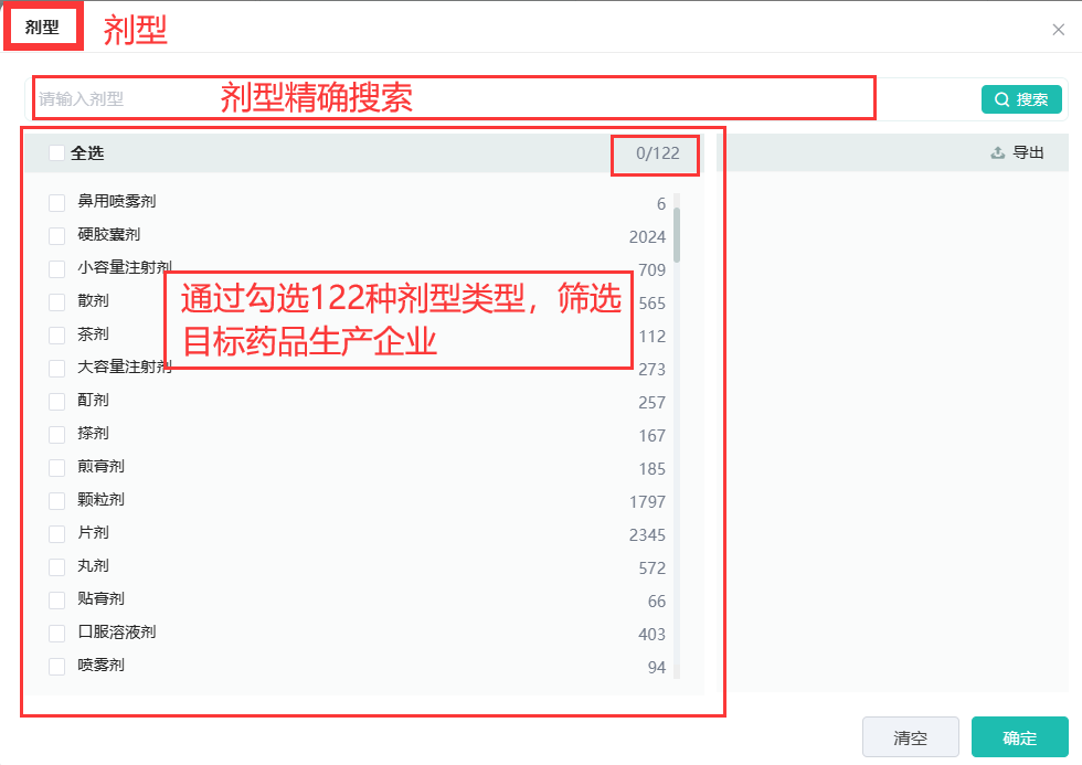 如(图1)通过条件筛选’剂型’点击’更多’可以看到如下页面,通过在搜索框精准搜索药品生产企业的生产剂型或筛选122种药品生产剂型进行查看,同样的每种剂型都显示了全国该剂型生产厂家的数量,方便更加直观预览剂型生产企业情况。