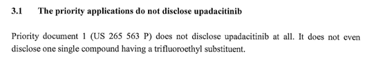 (1)欧洲该专利审查过程,审查员指出:优先权文件US61265563未记载乌帕替尼,故此本专利不能享有该优先权。
