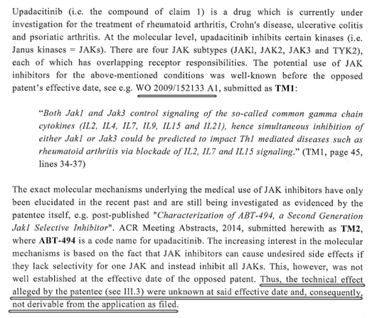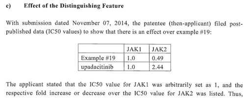 (1)欧洲该专利审查过程,审查员指出创造性的效果问题,后专利权人补充了试验数据,基于欧洲审查指南及相关规定,欧洲专利局接受了权利人补充的有关乌帕替尼选择性的实验数据,接受乌帕替尼的JAK1数据和选择性效果数据,并在实验结果的基础上认定乌帕替尼相对于WO2009/152133A1具备创造性,维持了专利权有效。