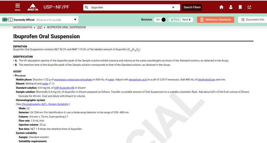 图3 USP-NF中布洛芬口服混悬液质量标准