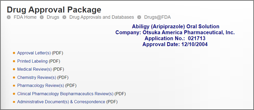 (3) Drugs@FDA Search: 可查询已批准上市药品的信息,包括说明书、审批历史、综述、剂型、规格、理化性质等;可通过药品的英文首字母和批准上市时间来分类查询,查询结果包括药品规格、剂型、给药途径、申报类型(如IND、NDA、ANDA)、批准状态、申请者。