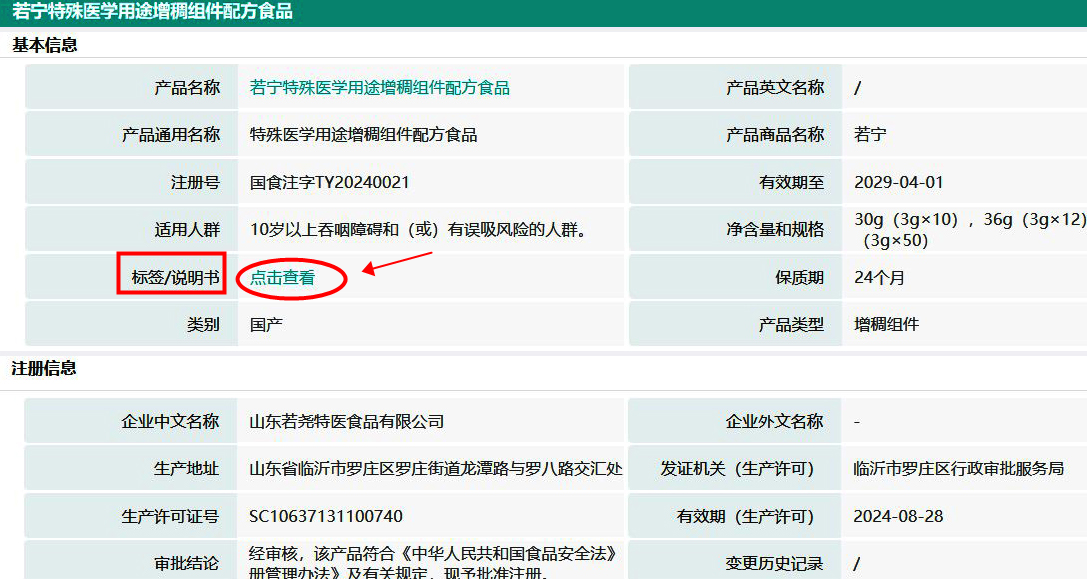 在其产品详情页面信息中会显示产品基本信息和注册信息,如搜索‘若宁特殊医学用途增稠组件配方食品’可以通过点击绿色字体看到该产品的产品通用名、产品名称、产品商品名称、产品英文名称、注册号、有效期、使用人群、净含量和规格、标签/说明书、保质期、类别、产品类型、企业中/外文名称、生产地址、生产许可证号、审批结论、备注信息、变更历史记录、有效期、发证机关(生产许可)等信息