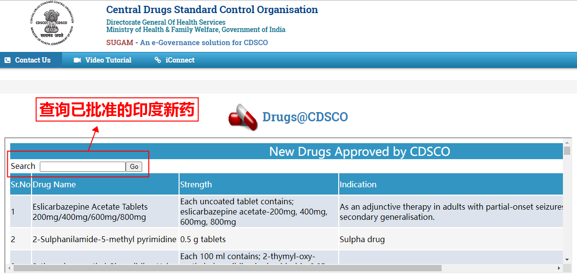 首先进入cdsco.gov.in官网首页拉至底部-->然后点击'DRUGS @ CDSCO'进入药品查询页面-->最后通过搜索框就可查询自1961年以来在印度已批准上市的药品。