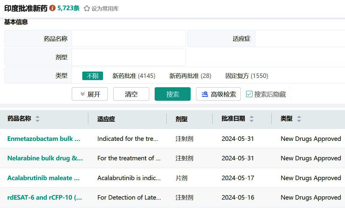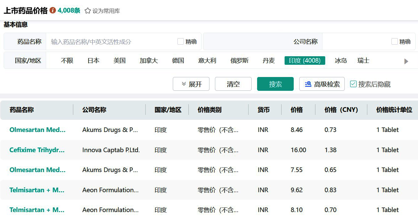 以药融云医药数据库系统V4.0企业版为例,就有收载主流72个国家已批准上市的药品信息,其中就包括了印度药品上市信息(印度批准新药数据库)和印度进口药品信息(印度进口药品数据库),前者可通过药品名称、适应症、剂型、批准类型等条件进行查询,后者则可通过药品名称、公司、批准号/申请号、批准日期进行检索,还有印度药品上市价格,如下图。