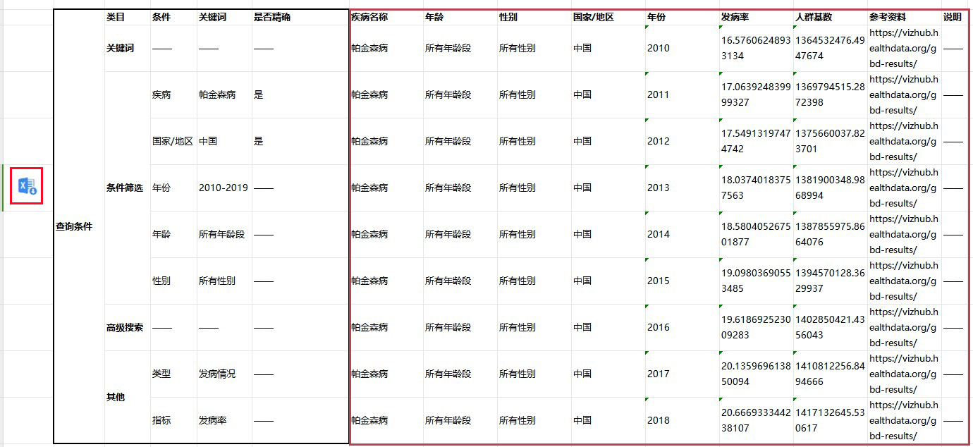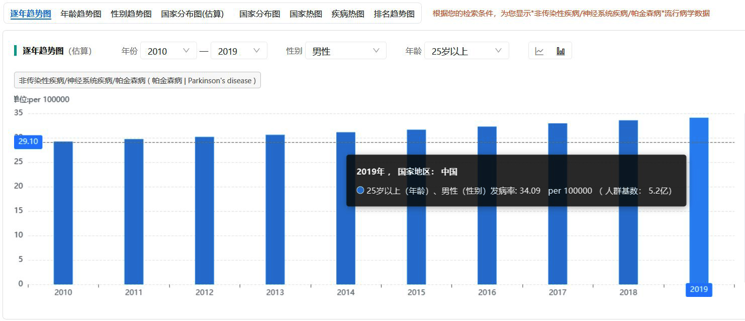 以搜索帕金森病为例,笔者选择了地区为’中国’,年份为’2010-2019’,性别为’男性’,年龄段为’25岁以上’的人群,通过下图的搜索结果页面可以看到符合条件人群的发病率呈逐年增长趋势,2019年该人群有5.2亿人,每十万人就有超34人发病,意味着2019年该人群有17.74万人发病。