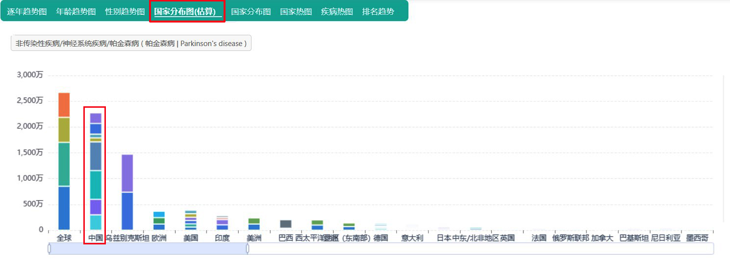 在国家热图数据分析浏览下可看见各国历年帕金森疾病的患病人数,也可通过国家分布图(估算)进行更为直观的柱状分析图或折线图浏览。