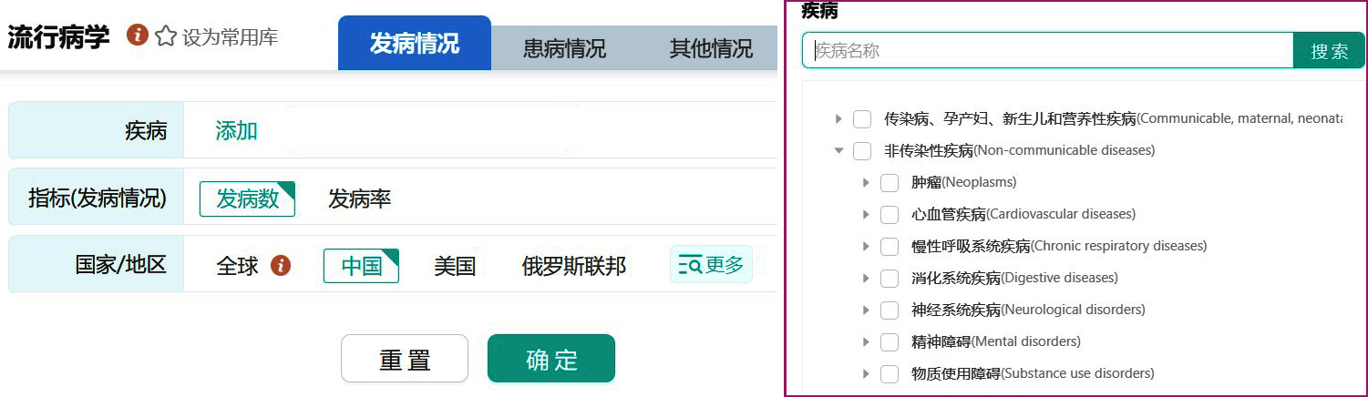 <实操演练> 首先进入该流行病学数据库可以选择发病情况、患病情况、其它三种情况下的发病人数、发病率、国家地区的筛选与疾病搜索精准查找信息。