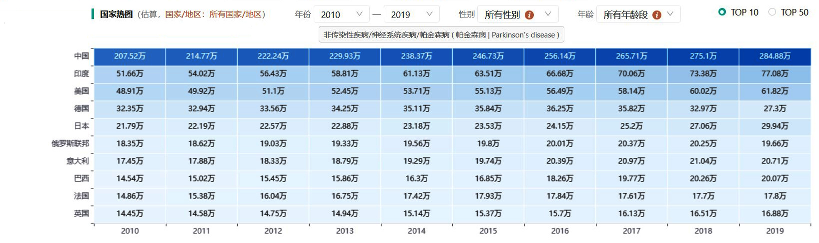 在浏览患病情况下选择中国的所有人群可知晓在2019年患帕金森疾病的人有284.44万,在2018年患帕金森疾病的人数为275.1万