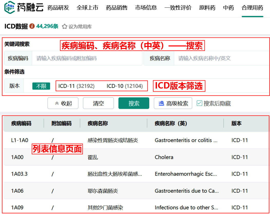 查询路径:药融云官网-->个人版或企业版-->合理用药-->ICD数据库。