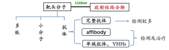 放射性核素偶联药物(Radionuclide Drug Conjugates,RDC)由靶头分子(多肽、有机小分子或抗体)、连接臂(linker)、放射性络合物(或放射标记分子)三部分构成(图1),相对于一般的放射核素(如氯化锶[89Sr])或组织趋向性核素药物(如常用18F-FDG等)具有更高的靶向性。随着FDA批准诺华Lutathera (177Lu-dotatate,2018年)和Pluvicto(177Lu-PSMA-617,2022年)上市,该类药物因疗效显著、副作用较低受到医药界广泛关注,开启了放射性核素药物用于肿瘤精准诊疗的新时代。